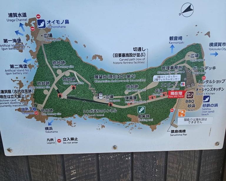 The island’s real name is Sarushima (猿島), literally “Monkey Island,” but the name comes from legend rather than wildlife. According to folklore, a white monkey once appeared to guide the Buddhist monk Nichiren safely across the dangerous waters of Tokyo Bay. In medieval Japan, monkeys were considered liminal beings — creatures that moved between worlds, messengers that appeared at moments of transition.