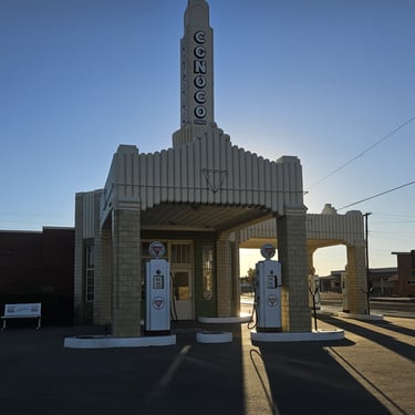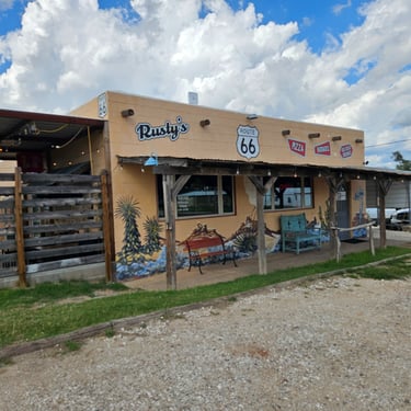 Once again we hit the road and this time, made it to Shamrock, Texas. Again an iconic Route 66 town, Shamrock’s Conoco Station made it on the big screen influencing the Cars movie, with Romero's Body Shop. Since we were hungry, and were just about done with sandwiches made out of the ice chest, there was a small homegrown burger diner next to the Conoco gas station, called Rusty’s. Not to be confused with the other diner that was part of the gas station building, Rusty’s is a popular among locals. Offering a solid burger and chips plate, hospitality was generous, and locals gathered to exchange data. Such a pleasant atmosphere and lunch, we will return to Rusty’s again in the future.