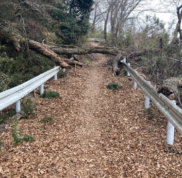 It was quiet out there. A small kinglet bird lingered nearby, its presence oddly ominous. We decided to turn back—down the deer trail, around the fallen tree, along the slippery slope, under the other fallen trunk, across the rusty bridge, and back up the leaf-covered path.