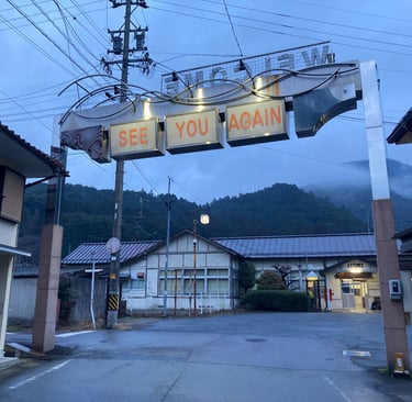 When the train arrives at the station, we are greeted by an enormous WELCOME sign outside Hida-Kanayama Station, and the first thing I notice is that it seems somewhat out of place. It’s not broken. It’s not neglected. It’s doing exactly what it was designed to do. Big letters. Cheerful confidence. English optimism stretched across a quiet street that doesn’t seem best suited for a zombie apocalypse movie.