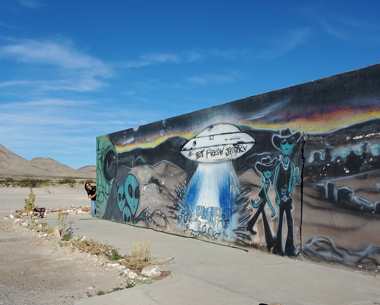 They also sell alien-themed souvenirs and cold drinks. It’s the last real convenience stop before the long desert run — and a great photo spot, with a yard full of UFO props. The building is covered in murals of aliens and flying saucers, set against the backdrop of the Pahranagat Valley hills.