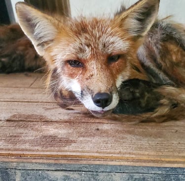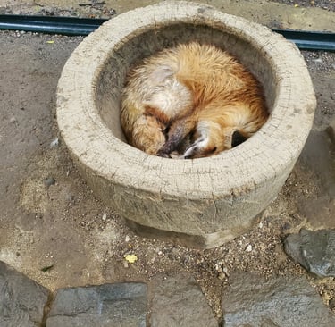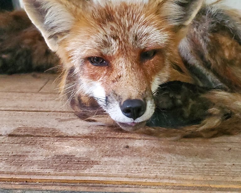 Inside, the foxes roam freely through a broad, tree-shaded enclosure dusted lightly with snow even in early summer. A few approached with wary curiosity; one ambitious male claimed ownership of my shoe by marking it — the price of admission, I suppose. Most kept their distance, slipping between trees or watching from the underbrush with those watchful amber eyes. Every so often we’d hear their yelp (gekko, げっこ) echo through the mist, strange and almost human.