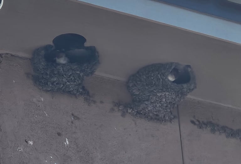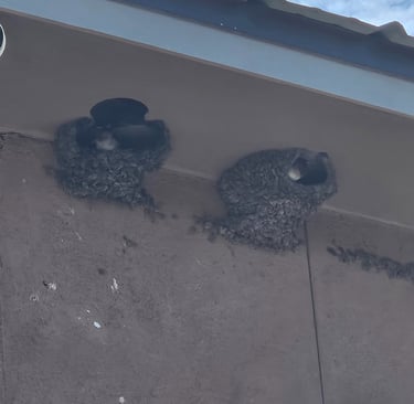 As we woke up in Chambers, Arizona, well, for that matter, even when we arrived at the hotel the evening before, one couldn't miss the stunning flight behavior of Cliff Swallows. With beautiful blue iridescent wings, these birds build their nest for two weeks straight during the hot summer months. Made out of circular dabs of mud they form with their beaks, like a skilled engineer, they connect them like adobe bricks, under eaves and overhangs of the hotel.