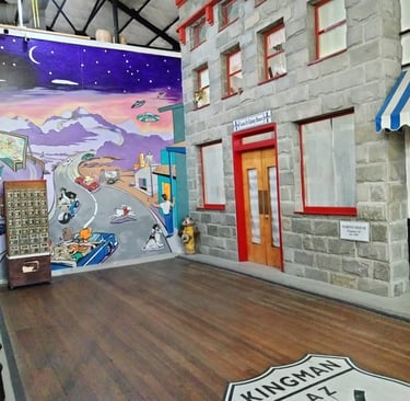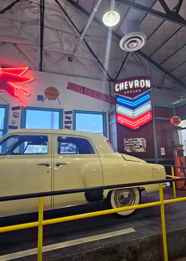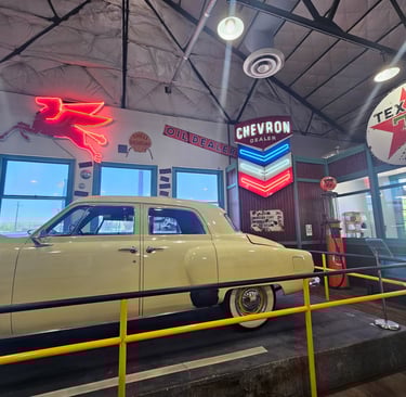 Slightly under two hours later, our bodies demanded a stretch break and the truck chimed in too, needing to rest. It was very warm, and we were looking for air conditioning relief that we quickly found in their Route 66 Museum. It was an adequate museum focused more on the history of the trail that preceded Highway 66 and thus lacked the actual construction, and ambience of the lived experience of the famed 66 Highway. It did have one small room with neon signs and a Studebaker, and a very cool electric car display which included a land-speed racer. A few other highlights included an old tesla, and many 3 to 4-wheeled buggies and golf carts.