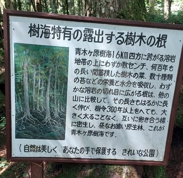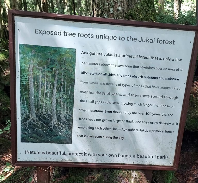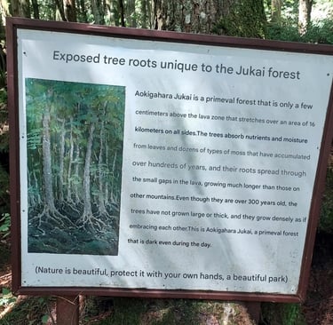 Today, Aokigahara is sadly known as a place where some go to end their lives. There are signs in the park that attest to this. There are suicide prevention placards with phone numbers and the there is the colored tape. Don't follow the tape. Authorities and volunteers patrol the trails and post signs with helpline numbers, encouraging visitors to reconsider.