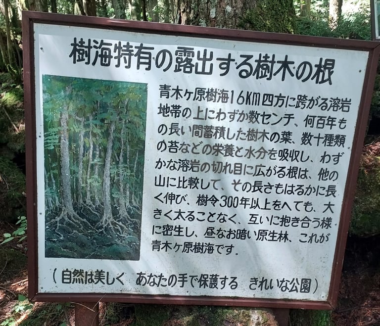 Aokigahara hugs the northwest base of Mount Fuji. Aokigahara Jukai, the Sea of Trees (Jukai). The floor of the forest is hardened lava from Fuji’s 864 CE eruption, leaving rocky, uneven ground carpeted with moss. The trees are so dense that wind is muffled and sunlight barely touches the forest floor, creating an atmosphere that is both peaceful and unnervingly still. There is, within the park, a small patch of the forest that shows how the land looked prior to the eruption in 864CE. but, it is a very small portion.