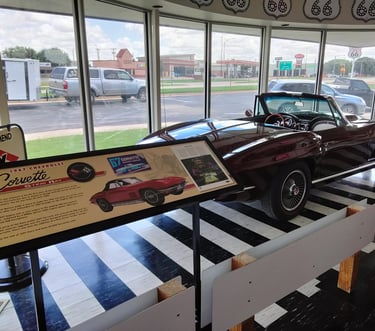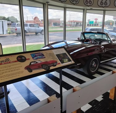 A bright red 1964 Chevrolet Corvette gleams in the lobby, and a jukebox hums “Get Your Kicks on Route 66.” Two friendly docents hand us a map and point us toward the main exhibit. We step through the entrance, leaving the gift shop behind and entering the road’s long memory.