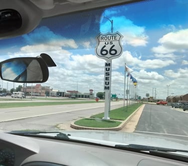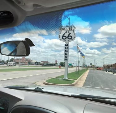 When we stepped back outside, the Oklahoma wind was humming across the plains. The old alignment of Route 66 cut west, weathered but unbroken. A green sign read “Amarillo 176 miles.”