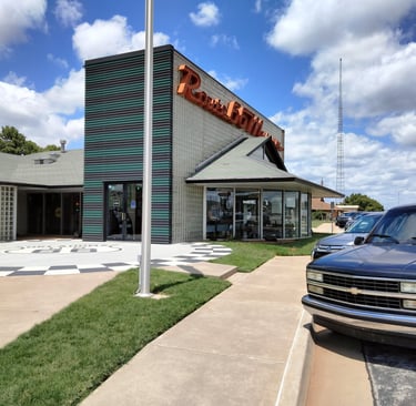 Our first stop after leaving Poteau was Okemah, a tidy little town with a Sonic Burger and a gas station. Everybody likes Sonic Burger. We fueled up, checked the oil, grabbed snacks, and headed west through the Sandstone Hills. It was Mary’s turn to drive, which meant it was my turn to nap — a system that works beautifully until the map starts to look like a dream.