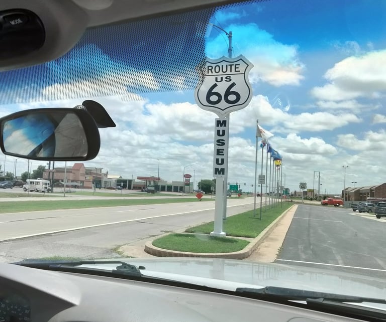 Across the highway stood the Oklahoma Route 66 Museum—a low, wind-hugging building of steel and glass. The kind of place that looks modern and vintage at the same time. Inside, it’s pure nostalgia.