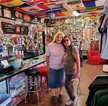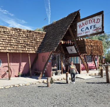 We didn’t meet Andrea but we met Brenda. Brenda is a greeter at the cafe who embodies the spirit of the place. She explained the history and took a picture of Mary and I behind the serving counter holding a Baghdad Cafe sign. She had that rare mix of docent and friend—the kind of kindness that feels like part of the landscape.