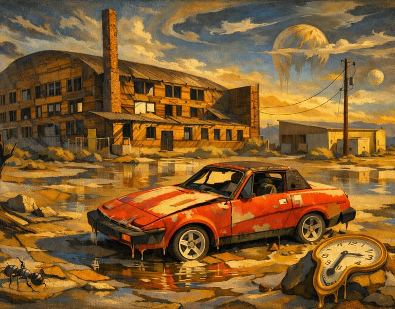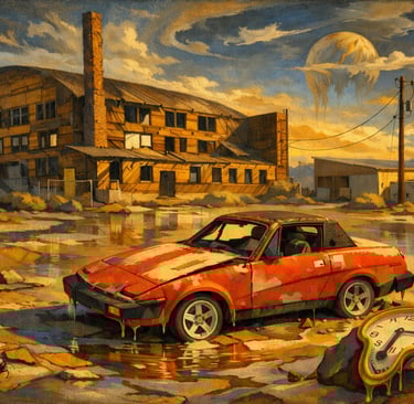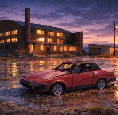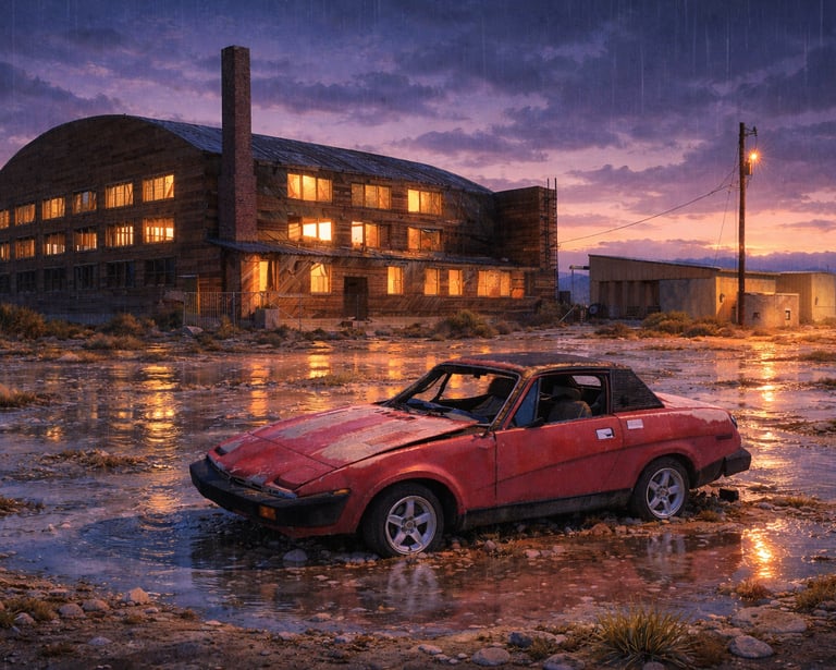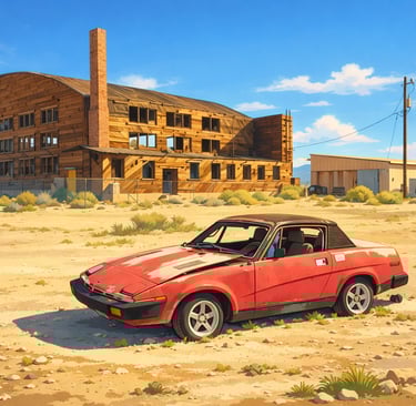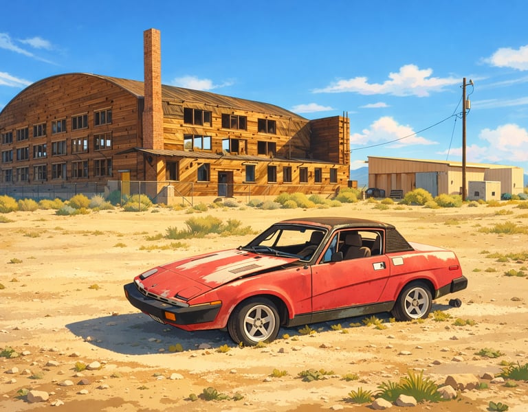 One of my favorite photographs I've taken recently is the above image of an abandoned Triumph automobile parked in front of a WW2 era aircraft hanger. I like it for it's historical reasons and what it represents as a reference, but, I felt there was more the photograph could offer. Looking at the images below transforming that photo into a soft, Ghibli-style image didn’t erase the place; I think it clarified the image. I think the rainy night imagery brought forward the mood that lingered with me long after I walked away. If I transform it into a 1940's style cartoon then it's just fun. Especially the cow.